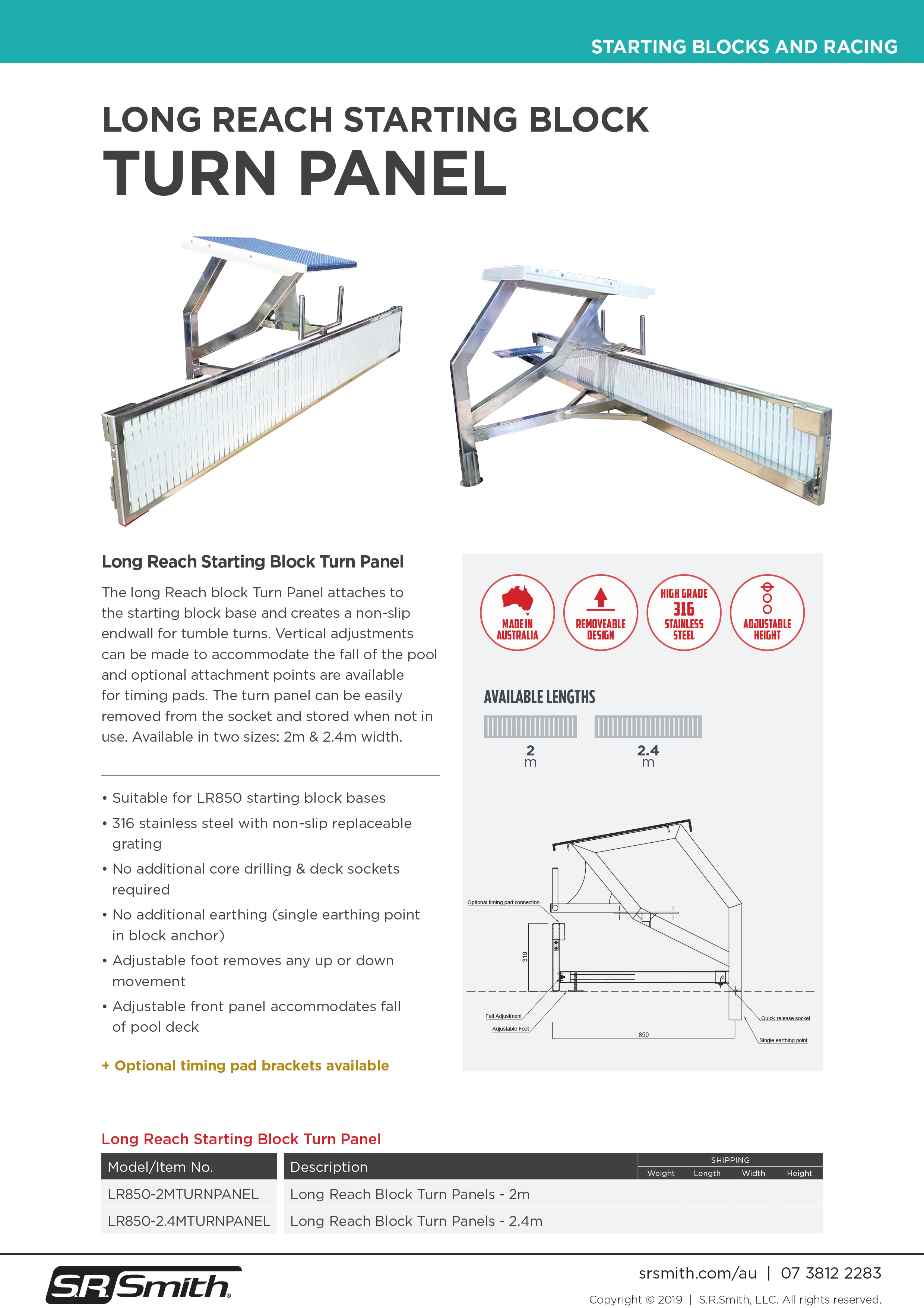 The Long Reach Block Turn Panel attaches to the starting block base and creates a non-slip endwall for tumble turns. Vertical adjustments can be made to accommodate the fall of the pool and optional attachment points are available for timing pads. The turn panel can be easily removed from the socket and stored when not in use. Available in two sizes: 2m & 2.4m width.