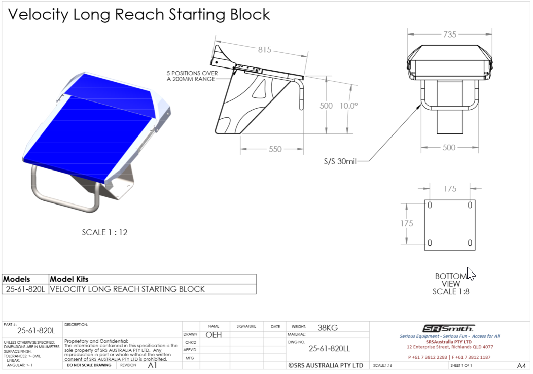 The Velocity Long Reach Starting Block is an elite competition platform with a track start, adjustable to 5 positions. The extended reach base is suitable for pools with overflow gutters. Chem set anchors are included.